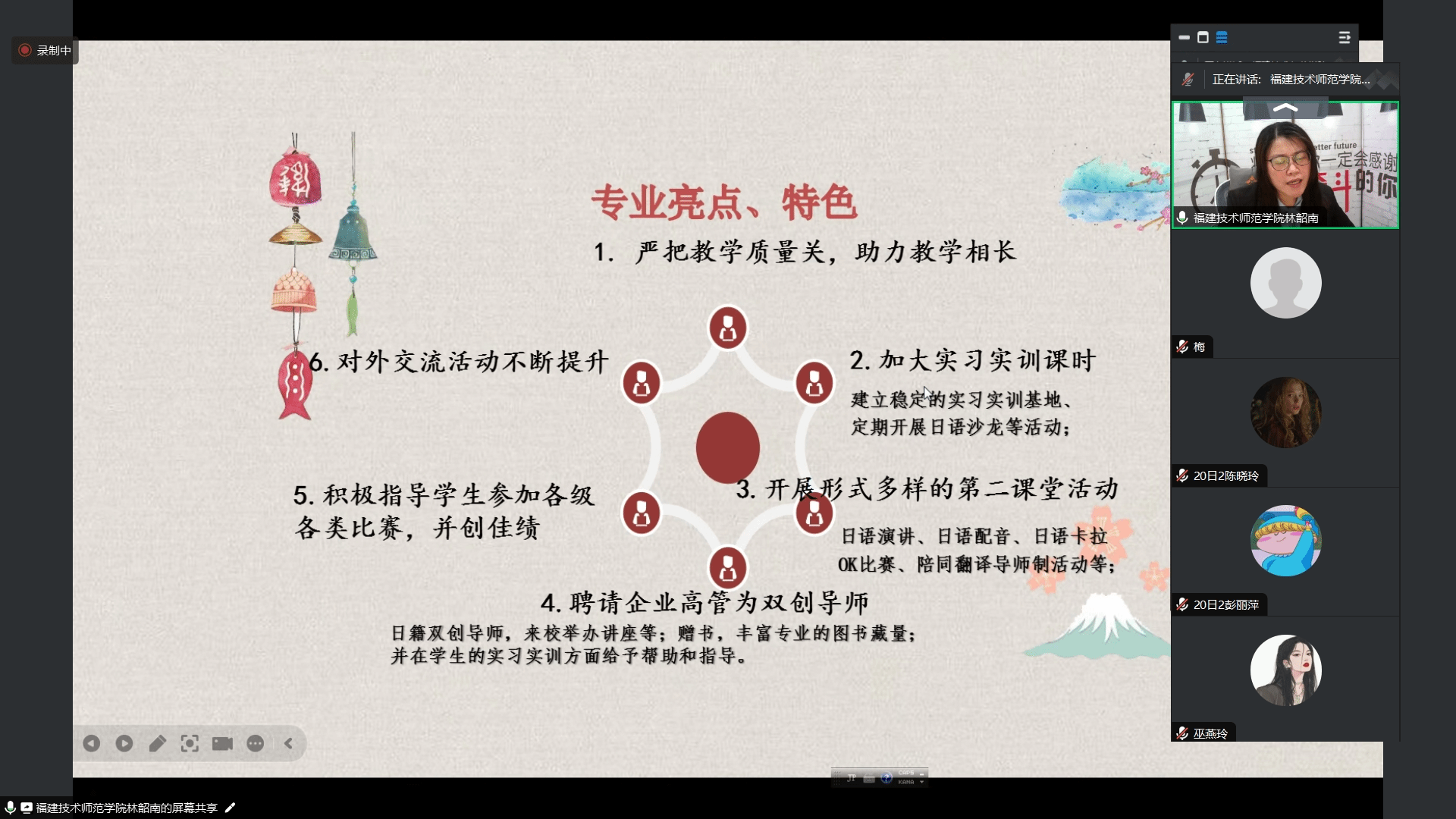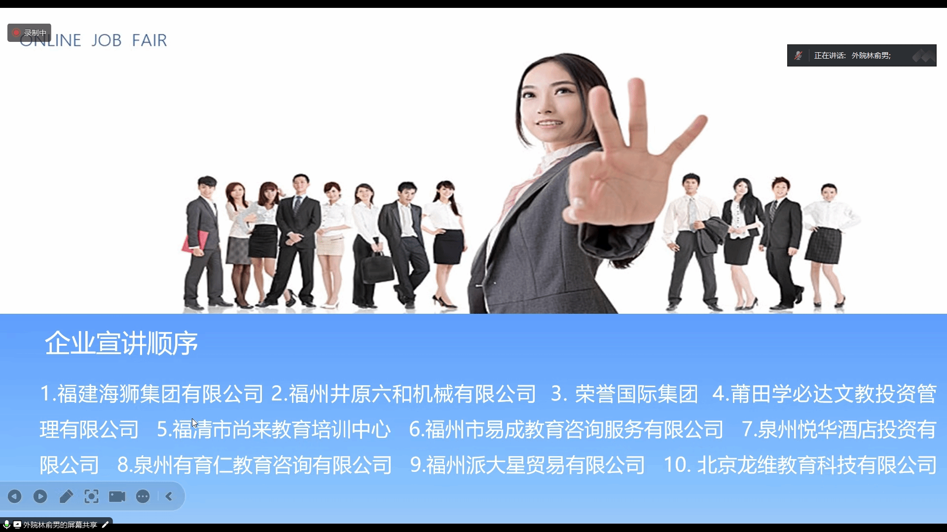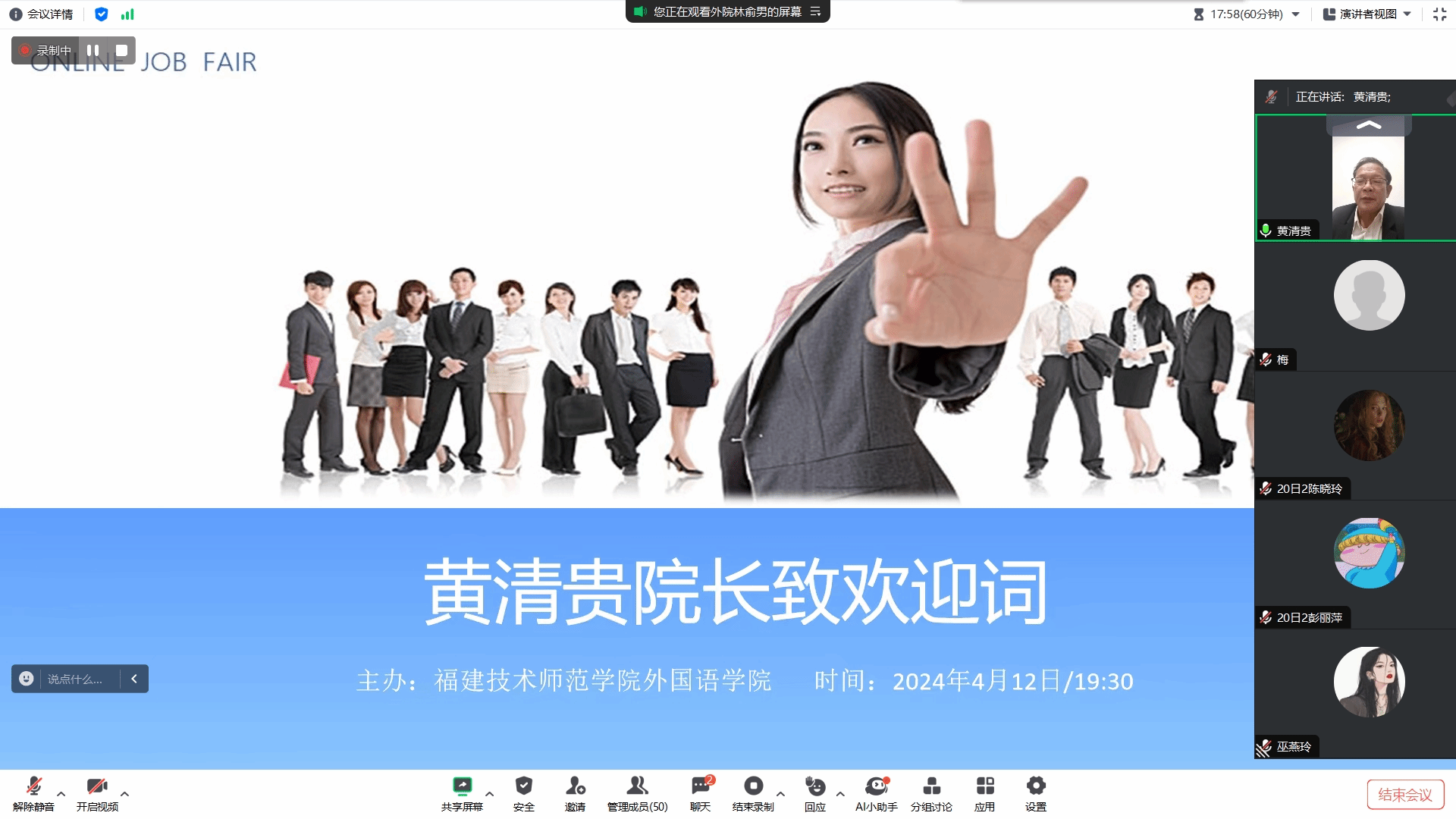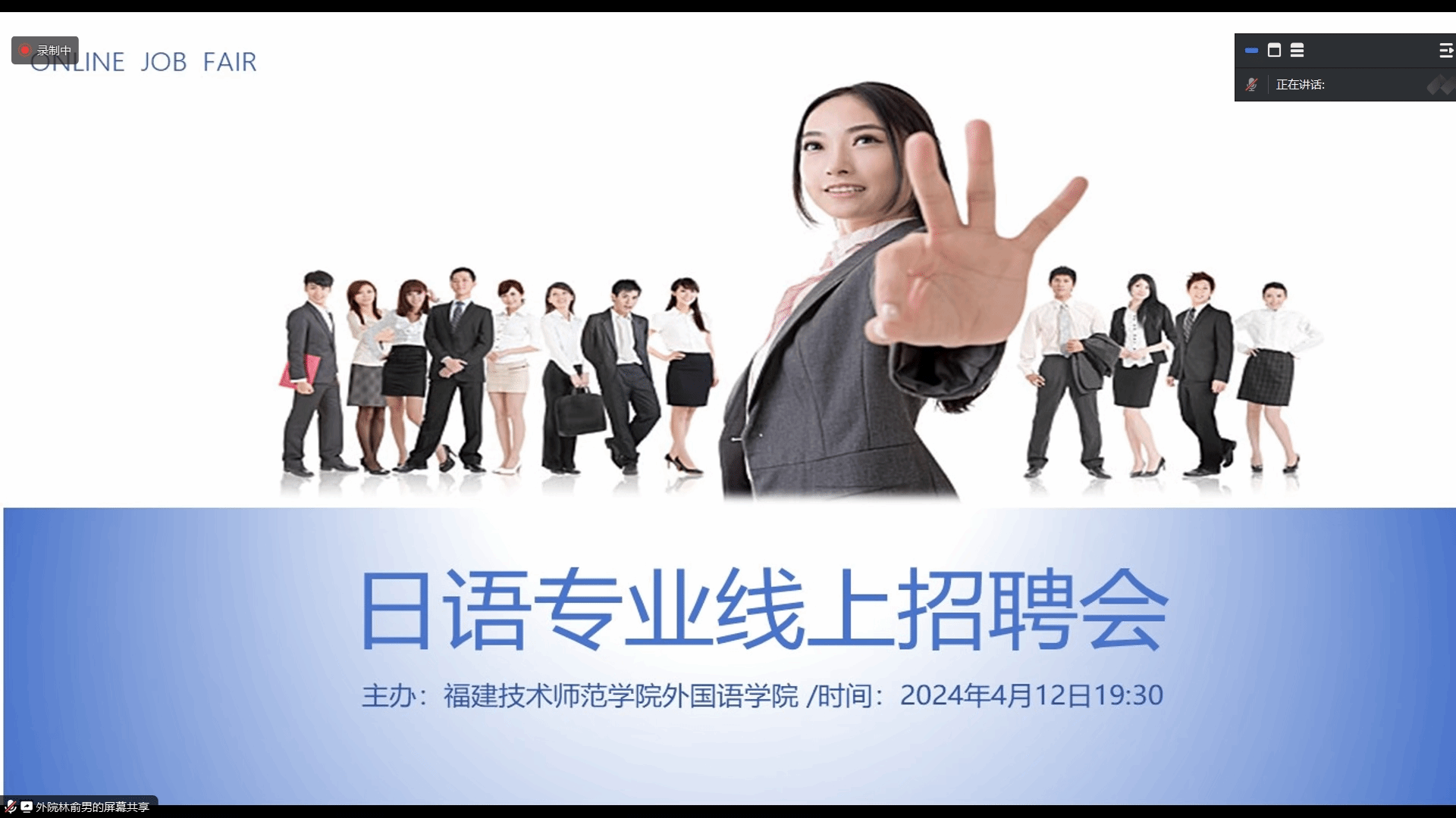 4月12日晚,我院举办日语专业毕业生专场线上招聘会。福建海狮集团有限公司、福州井原六和机械有限公司、荣誉国际集团等10家企业单位受邀参会,带来了71个就业岗位。院领导、毕业班辅导员、日语骨干教师以及全体日语专业毕业生参加了招聘会。