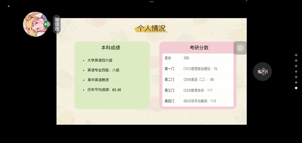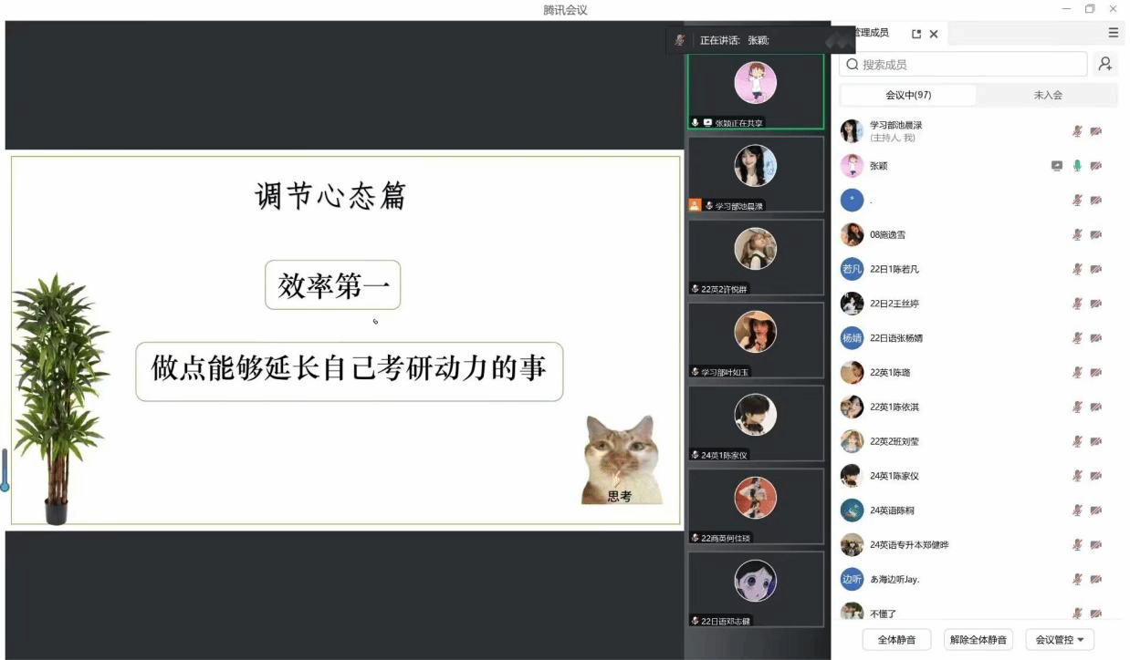 为助力同学明确考研目标,掌握备考技巧,11月10日晚,我院于腾讯会议举办考研经验线上分享交流会。活动邀请了广东外语外贸大学翁菲悦(英语笔译专业)、闽南师范大学胡锟敏(学科教学英语专业)、福建师范大学张颖(日语笔译专业)等三位优秀的我院2024届校友分享考研经验。分享会由院辅导员游佳鸿主持,辅导员李冬静以及有考研意向的我院学子近百人参加。