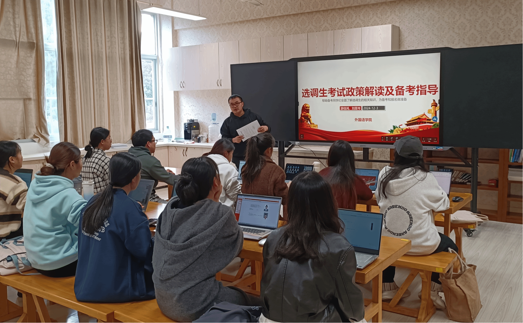 为进一步做好我院2025年福建省选调生报名工作,引导和鼓励毕业生面向基层就业,12月3日下午,我院在科学楼604举办了选调生考试政策解读及备考指导讲座。讲座由毕业班辅导员游佳鸿、刘昱岑老师主讲,近20位2025届毕业生参加。