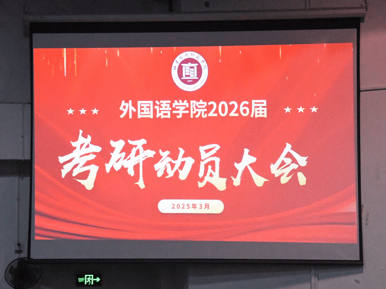 为充分调动学生考研积极性,帮助学生了解考研形势,明确考研目标,3月4日晚,我院于向高园报告厅二召开考研动员会。我院副院长胡永祥、台湾籍专家杨耀诚博士及英语专业副主任徐勤良、辅导员李冬静、游佳鸿和2026届全体学生参加了此次会议。