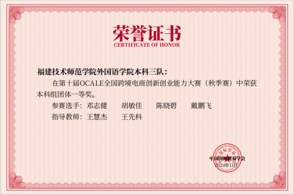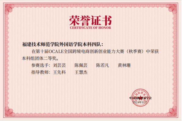 近日,第十届OCALE全国跨境电商创新创业能力大赛(秋季赛)圆满落幕。我院日语专业2022级学生邓志健、胡敏佳、陈晓碧、戴鹏飞(队伍名称:外国语学院本科三队)及刘芸芸、陈佩芸、陈若凡、黄林珊(队伍名称:外国语学院本科四队)在王慧杰、王先科两位老师的指导下,从全国438所高校中脱颖而出,分别荣获本科组团体一等奖1项,团体二等奖1项的好成绩。