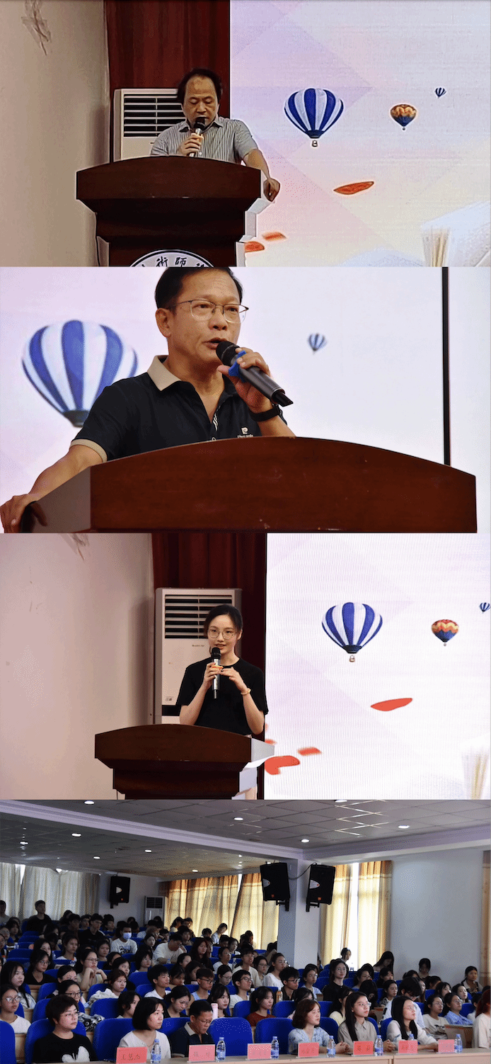 9月24日上午,我院在科学楼报告厅举行迎新大会,院领导、专业主任、辅导员等均出席大会。首先,林书记致辞,对新生的到来和对学校的选择表达了欢迎和感谢,并对如何度过大学四年生活提出了建议:一要学会包容,包容大学最根本的相处之道;二要学会做事,做事是大学生最快捷的成长方式;三要懂得做学问,做学问是大学里最重要的事;四要学会做人,做人是大学修养的最终目标。随后,新生代表翟异初同学和老生代表黄蓉琦同学先后上台发表自己的感想,从不同角度阐述了大学人生对青年人成长的重要作用,强调了大学生的社会使命感和责任感。黄院长则用自己入读大学当天看到的一首诗歌《台阶》与新生们共勉,并分享了自己的原创诗歌《迎新有感》,寄望于诗,鼓励全体新同学在大学生活中抓紧时间、抓紧学习、抓紧生活。