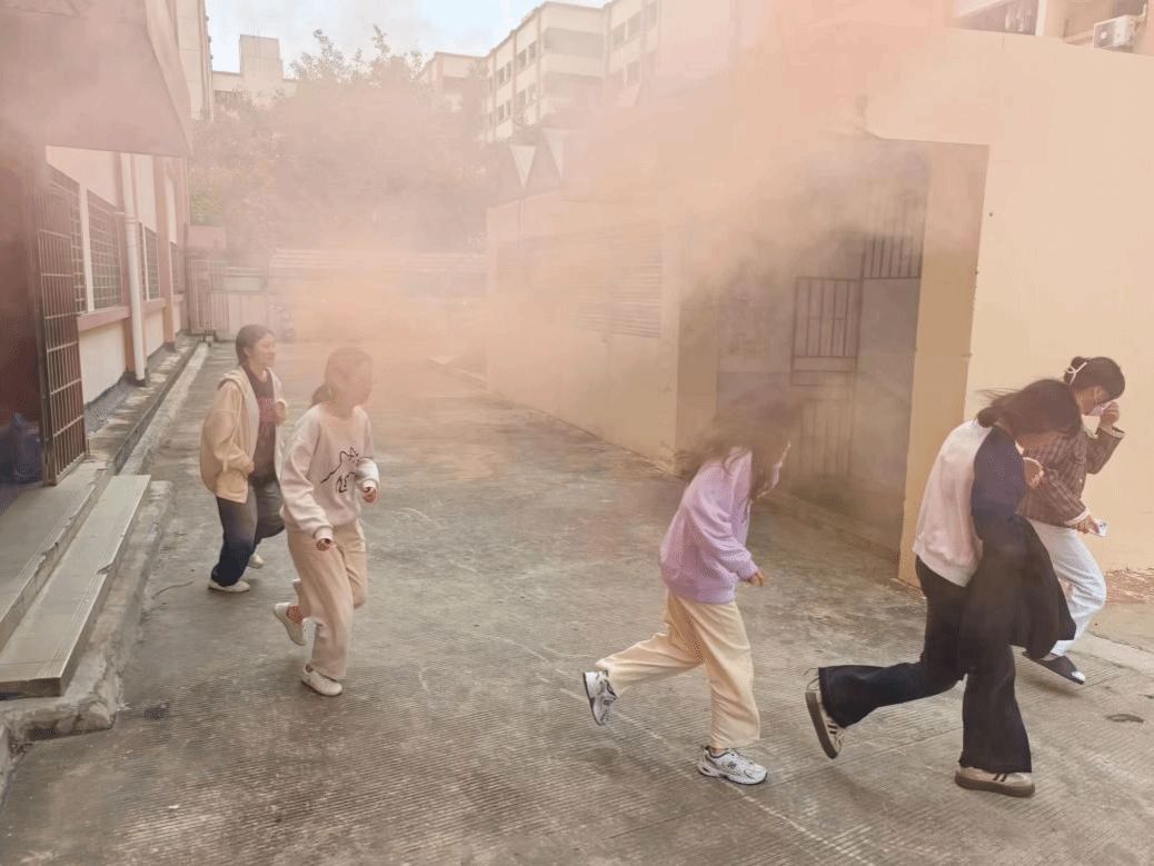 逃生演练活动按照既定方案有序开展。中午时分,则徐园里警报声骤然响起,烟雾随即弥漫整个宿舍楼,正在宿舍休息的同学们应声夺门而出,快速有序地掩着口鼻沿着安全路线撤离宿舍楼,到达指定集合地点集合。