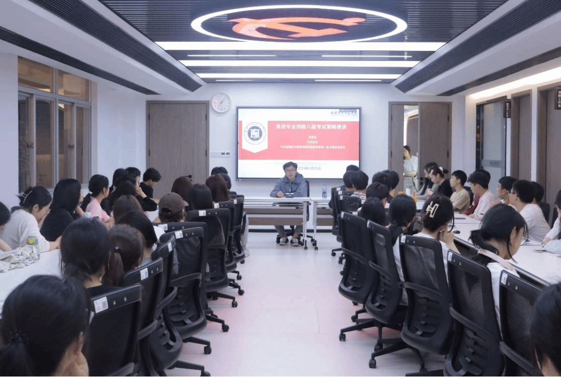 为进一步提升我院学生英语专四、专八考试通过率,3月25日,我院在一站式学生综合服务中心开展“英语专业四级八级考试策略漫谈”专题讲座。本次讲座由外国语学院英语专业徐勤良老师主讲,我院学生积极参与此次讲座。