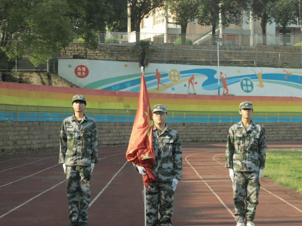 空旷的田径场上,当豪迈而雄壮的《义勇军进行曲》响起的时候,鲜艳的五星红旗随之冉冉升起。全场师生神情肃穆,面向红旗行注目礼。五星红旗在五月晨曦的映照下,迎风飘扬,显得格外耀眼夺目。