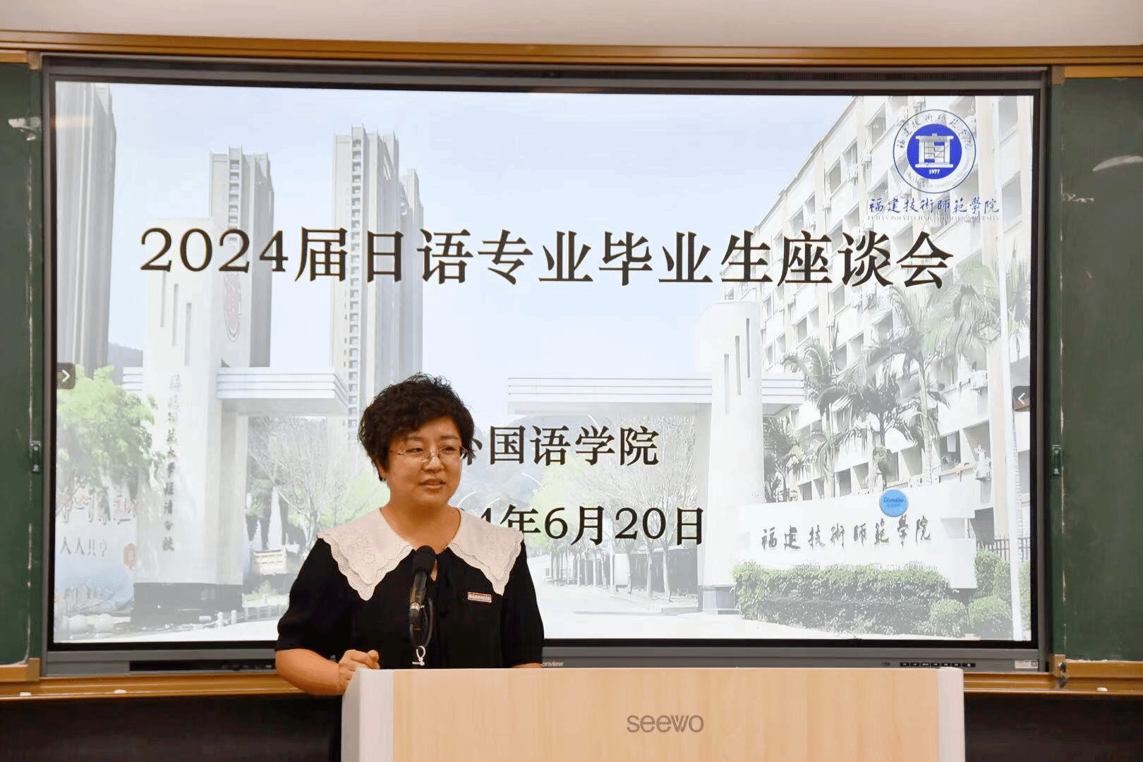 座谈会后,日语专业教师及外教熊泽宏老师与学生进行互动交流,对即将离校的同学们寄予了殷切希望,鼓励他们在漫长的人生中要大胆尝试新事物,勇敢追求幸福人生;章小叶老师回顾与同学们走过的岁月,勉励学生要能做到“自食其力,身心健康”;林巧英老师鼓励毕业生们在今后的工作和学习中要能始终保持谦虚、坚韧的良好品格,用自己的智慧和勇气不断追求更好的自己,最终能够拥有幸福的生活和美满的婚姻;廖永倩老师叮嘱学生,毕业后遇到困难希望能学会及时与他人沟通交流,经历每个人生新阶段的重要喜悦时能与他人及老师们分享;苏美盆老师勉励毕业生,生活五彩斑斓,唯一不变的是变化,要在变化中求生存、求发展、求创新,面对关键选择,认真把握人生给予,“万物皆有时,时来不可失”;孔祥惠老师寄语毕业生,不管在什么时候都不要忘记去生活,愿大家做一个自知,自信,自洽,自容的人;王先科老师寄语毕业生,要敢于用自己的实力证明自己,怀揣着一颗热爱生活的态度做好自己,做好社会中的“我”;最后,专业主任王慧杰表示,希望毕业生不管今后在哪里,都能将母校当成自己的家,把老师们当成关心爱护大家的家人,有时间有机会多联系,常回母校看看。