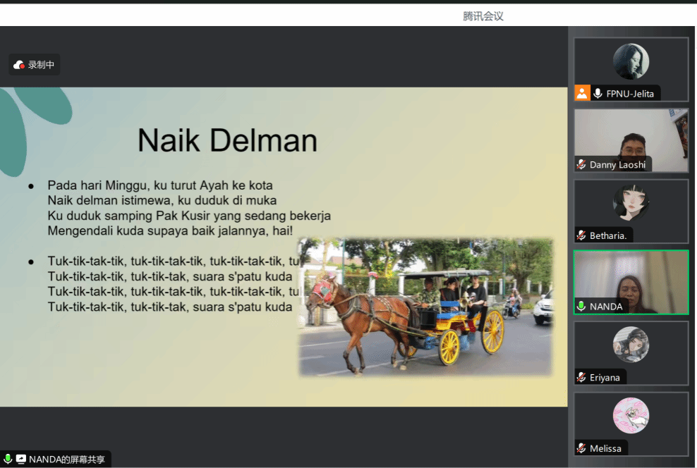 沙龙教学主要围绕印尼社会文化概貌和基础日常用语展开。印尼籍教师以其广博的学科知识和深厚的文化素养赋能课堂教学,通过精心设计教学环节,制作精美课件,循序渐进、由浅入深地向同学们全景式展示了印尼人民衣食住行等方面的日常生活图景。运用比较和发展的视角,重点阐述了印尼饮食文化演进、印尼社交礼节、节庆礼仪、传统和现代交通方式、热带自然景观、历史人文景观等方面的内容。穿插于上述主题展开的中印尼文化比较以及两国交流史知识的融入与自由讨论更让课堂焕发盎然生机与活力。如阿南达老师在讲述印尼传统交通工具马车时,便与我国古代重要的交通工具马车展开比较,进而拓展到中印尼古代交通工具轿子的异同比较等。伊娃老师在介绍印尼历史文化景观时,重点介绍了印尼三宝垄的“三保庙”,进而引入古代时期中印尼两国交流史的讲解。此外,印尼籍教师在教学活动中巧妙融入印尼文化的中国元素,增进了学生对中印尼两国文化交流史的认识和了解,进一步激发了同学们深入学习和了解中印尼文化关系史的兴趣和信心。