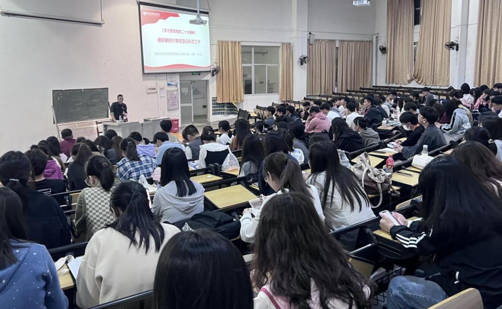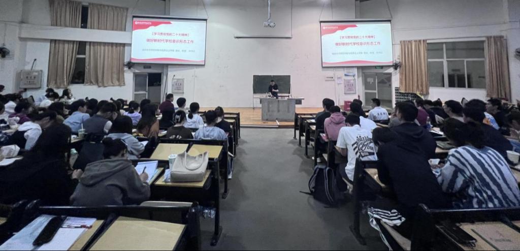 为深入学习宣传贯彻党的二十大精神,有力推动学习贯彻习近平新时代中国特色社会主义思想主题教育走深走实,5月10日晚上19点,校党委讲师团成员、马克思主义学院院长林书红教授以《学习贯彻党的二十大精神,做好新时代学校意识形态工作》为题,在五马山校区向高园报告厅(二)为我院学生党员及入党积极分子上专题党课。外国语学院学生党员、入党积极分子等一百余人参加学习。