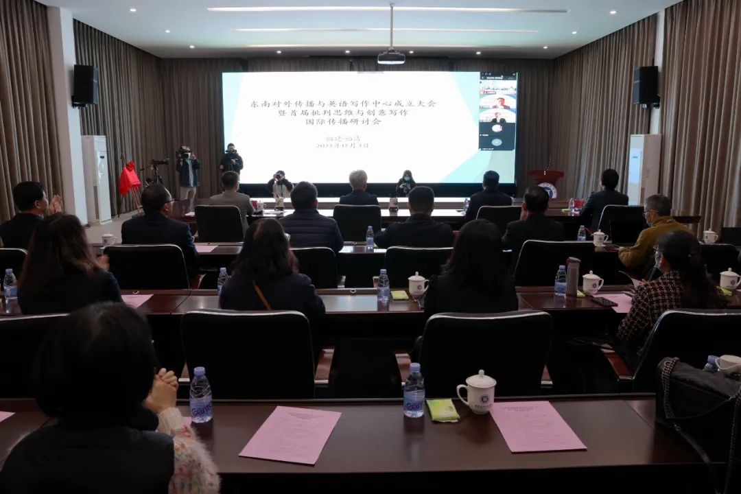 12月1日上午,由福建省政府新闻办指导的东南对外传播与英语写作中心成立大会暨首届批判思维与创意写作国际传播研讨会在我校五马山校区图书馆学术报告厅举行。大会以线上线下相结合的方式举行。中国外文局原常务副局长郭晓勇,中国国际公共关系协会副会长、学术委员会主任、国际关系学院原副校长郭惠民,中共中央党史和文献研究院研究员俞晓秋等专家学者通过线上方式参加会议。中共福建省委宣传部副部长、福建省政府新闻办主任叶雄彪,闽南师范大学副校长张龙海,校党委书记赖海榕等到场出席。成立大会由校党委委员、副校长陈志勇主持。