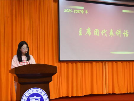 新一届学生会主席吴子诺代表新一届两委成员发言,她对46位新干事的到来表示欢迎,希望大家准确自身定位,多多交流,及时反馈,不断总结改进工作。