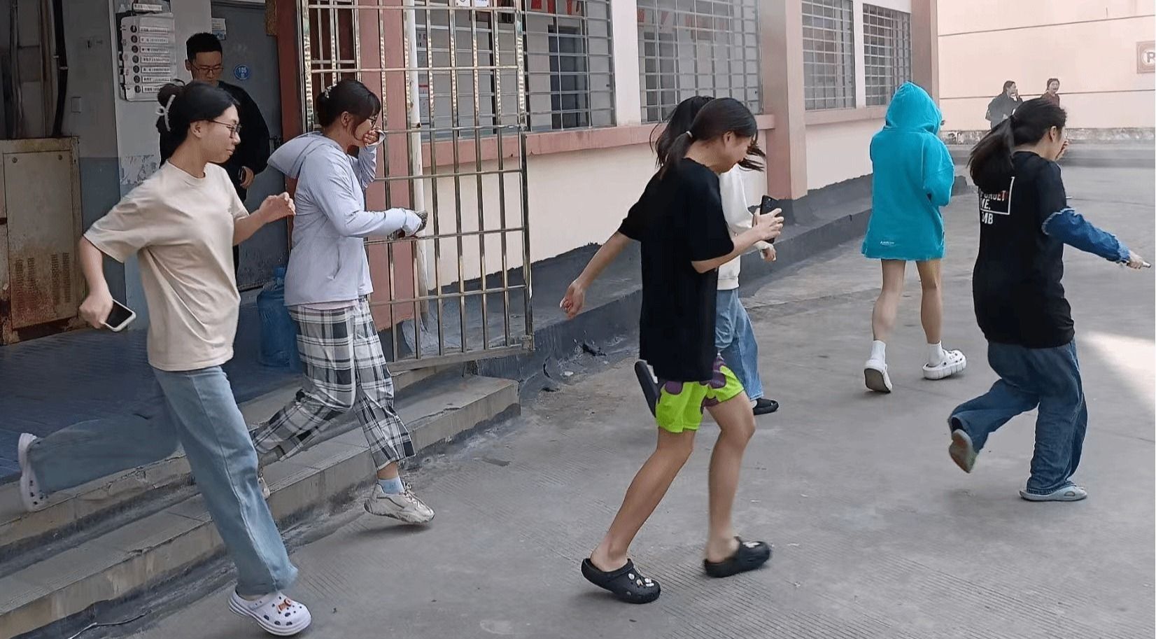 逃生演练活动按既定方案开展。中午时分,则徐园里警报声骤然响起,打破了午间的宁静,烟雾顿时在四栋宿舍走廊里弥漫开来,正在宿舍休息的同学们应声夺门而出。他们纷纷沿着安全路线,或手捂口鼻,或佩戴口罩,或靠墙躬身前行,撤离出宿舍楼,跑向指定的集合地点。整个演练过程快速、安全、有序。