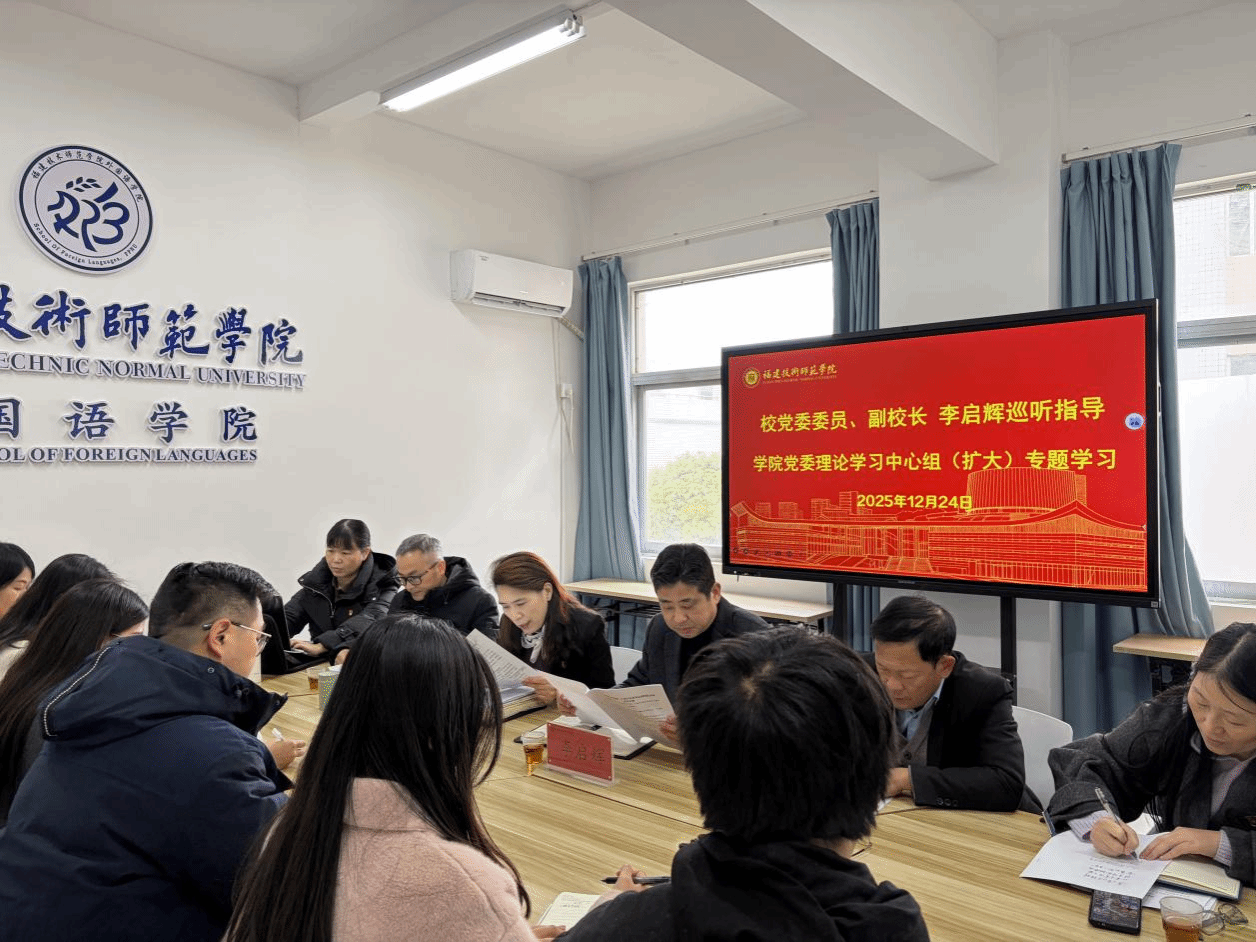 校党委委员、副校长李启辉作了讲话。他强调,学院要认真学习领会党的二十届四中全会精神,把握全会的重大意义和精神实质,切实把思想和行动统一到党中央决策部署上来。要紧紧围绕学校办学定位,结合外国语学院实际,主动谋划学科优化升级,持续改进人才培养质量,持续增强国际传播能力,精准推进各项工作,为学校高质量发展注入强劲动力。他要求,岁末年初,学院要进一步提高政治站位、压实工作责任,抓实事业发展、安全稳定等重点工作,为新一年各项工作开好局、谋好篇、布好局。