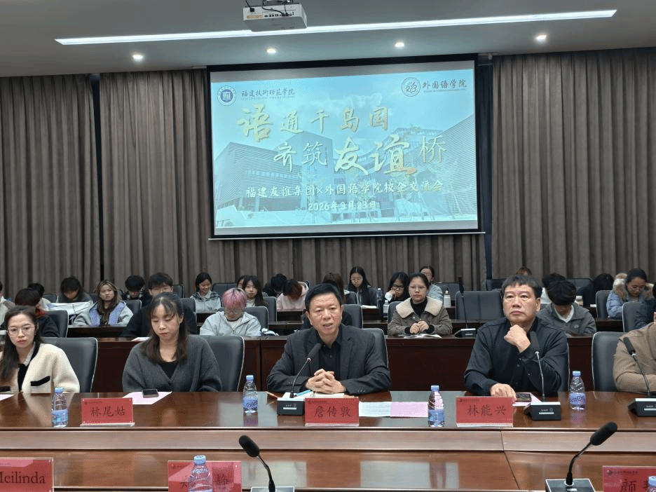 近日,我院与福建友谊集团在华贞学术报告厅联合举办“语通千岛国 齐筑友谊桥”校企交流会。福建友谊集团副总裁詹传敦、印尼分公司负责人林能兴及员工代表应邀出席。我院副院长郑静,印度尼西亚语专业主任颜碧洪,相关辅导员及全体印尼语专业师生参加活动。交流会由颜碧洪主持。