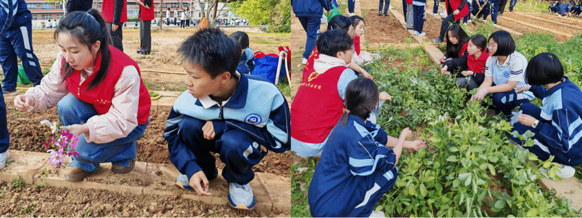 活动现场,在附属中学劳动实践指导老师的现场讲解与示范下,大学生与中学生结对协作,松土整地、清理杂草,共同种下向日葵。在摘豆、剥豆环节,大家围坐一起,边劳作边分享学习生活,生动践行了团结互助精神。