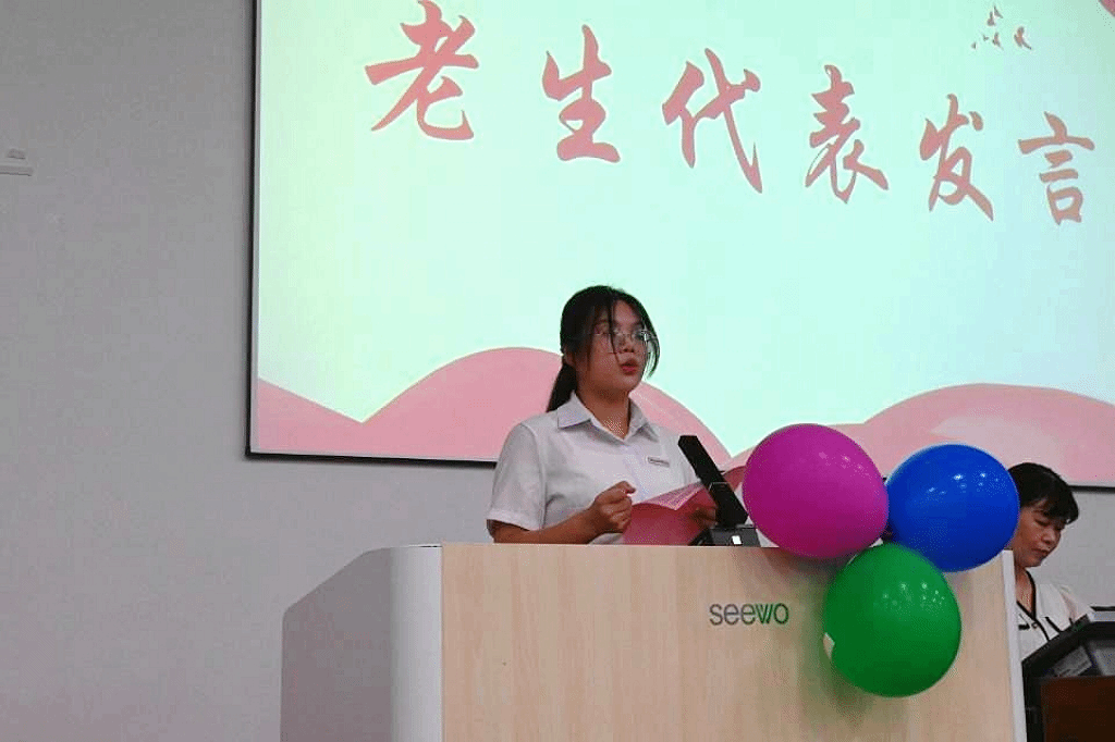 会上,老生代表2021级商务英语2班陈静琳,分享了自己在大学三年的成长经历,并提出学会生活和正确面对内卷的重要性。她鼓励新生们学会在大学生活中找到平衡,以乐观心态面对挑战。新生代表2024级商务英语1班黄丽阳在发言中,代表全体新生向老师们和学长学姐们表示感谢与敬意,并表达了新生们对未来的憧憬与自我超越的渴望,呼吁同学们共同在学院大家庭中创造辉煌。她强调将珍惜时光,勤奋学习,践行校训精神,实现全面发展。