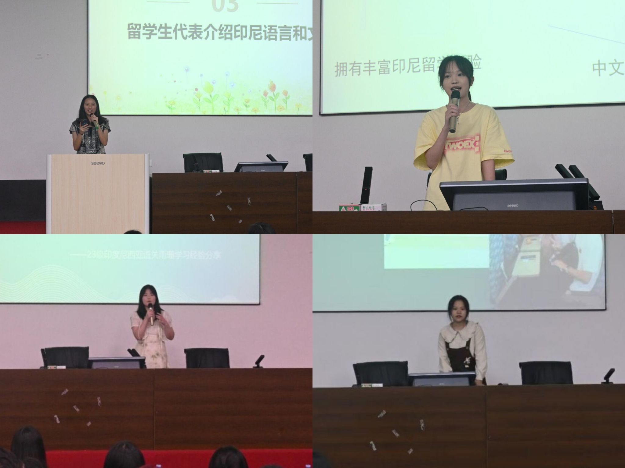 在学习经验分享环节,23级林欣、关雨珊两位同学分别就印尼语专业的优势、专业活动、学习难易程度和学习方法等方面分享了各自经验。中印尼青年互访学习游学活动的参加者、23级张舒欣同学也分享了她在游学过程的所见所闻和收获。