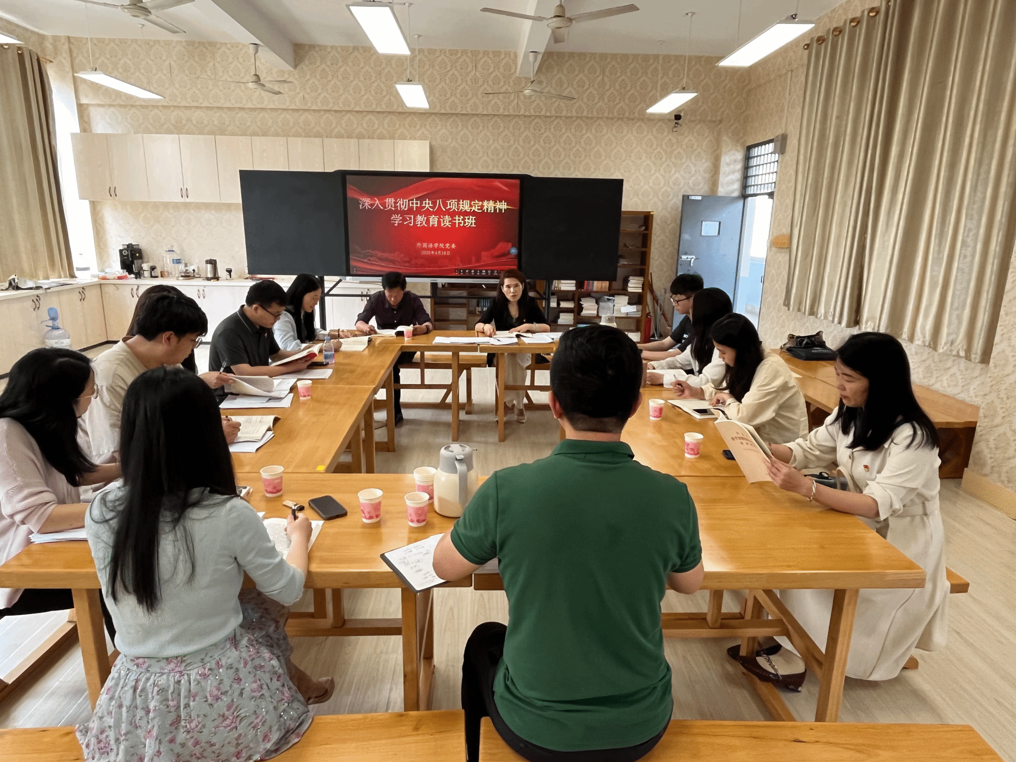 4月18日下午,我院党委在科学楼604举办深入贯彻中央八项规定精神学习教育读书班暨党委理论学习中心组(扩大)学习会。学院党委副书记(主持工作)陈娟珍主持读书班和学习会,学院党政领导班子成员、党委委员、纪委委员、各党支部书记等参加学习。