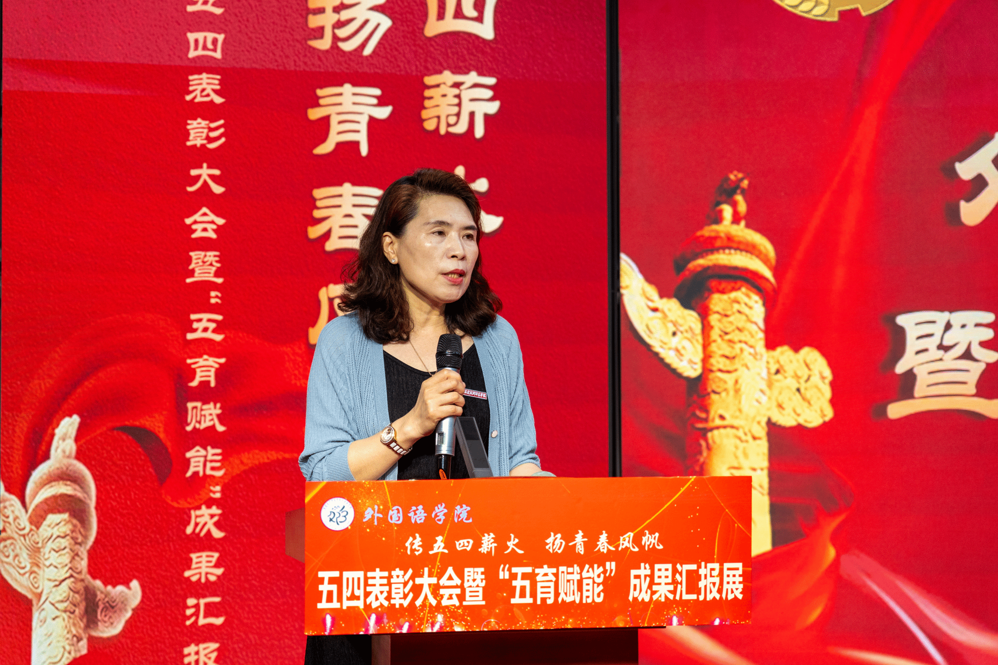 为弘扬五四精神,表彰先进典型,进一步巩固我院“五育”育人成果,5月15日晚,我院在科学楼金泰学术报告厅召开了以“传五四薪火,扬青春风帆”--五四表彰大会暨“五育赋能”成果汇报展。院党委书记陈娟珍、副院长肖晶及院团委负责人、各专业主任、辅导员和受表彰学生代表参加本次大会。