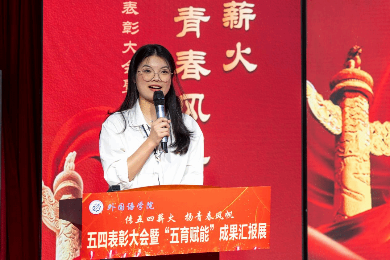 大会由“语绎青春•共振五四脉搏”“星耀外院•礼赞青春榜样”“逐梦韶华•同绘时代新篇”三个篇章组成,以多语种多文化为载体,通过英语朗诵、微党课、日语俳句、印尼语话剧、外语歌曲串烧、五四知识竞答等喜闻乐见的表现方式,全方位展现我院“五育赋能”的工作成果,生动诠释了五四精神的核心内涵,展现了我院学子勇担使命的时代担当。