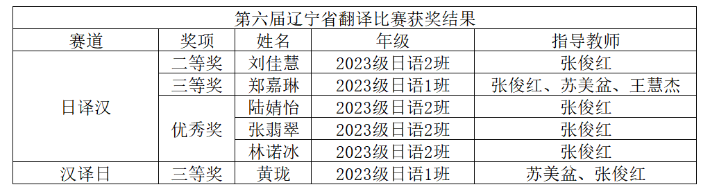 在第六届辽宁省翻译比赛中,我院日语专业学子斩获日译汉二等奖1项、三等奖1项、优秀奖3项,汉译日三等奖1项(具体名单见附图)。