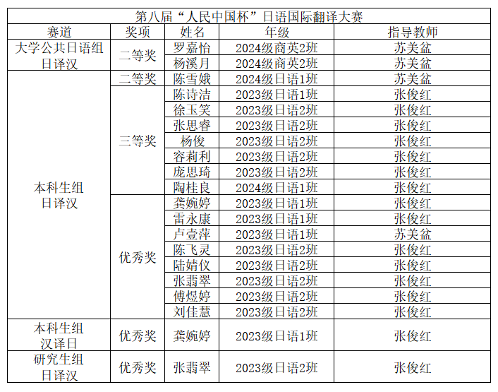 在第八届“人民中国杯”日语国际翻译大赛中,我院学子斩获大学公共日语组日译汉二等奖2项,本科生组日译汉二等奖1项、三等奖7项、优秀奖8项,本科生组汉译日优秀奖1项及研究生组日译汉优秀奖1项(具体名单见附图)。